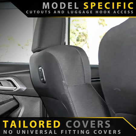 This product includes covers for both front bucket seats and headrests, featuring a full back design with map pockets.